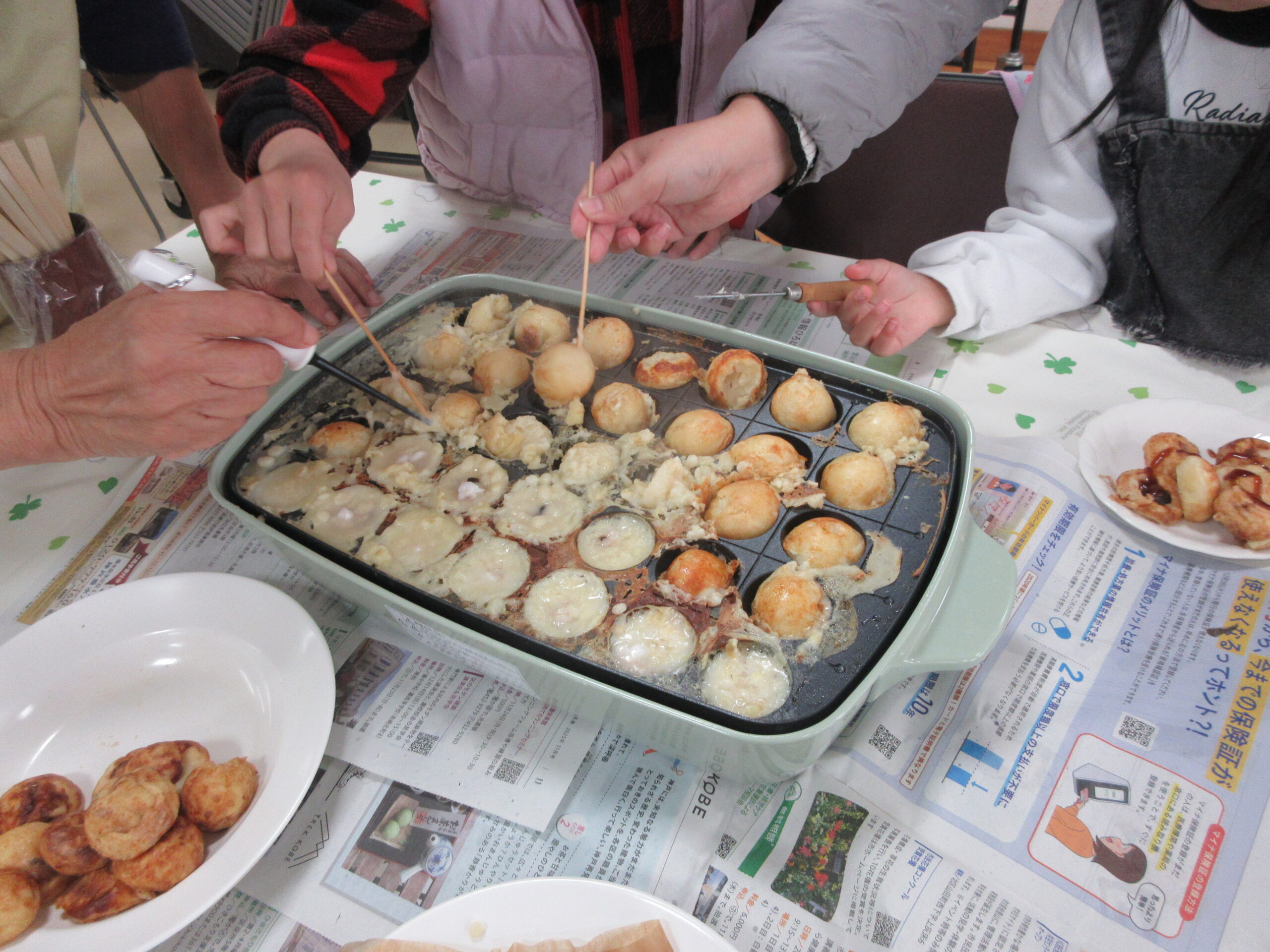 たこやきは参加者が自ら焼くセルフ方式で、衛生面にも気を付けつつ、